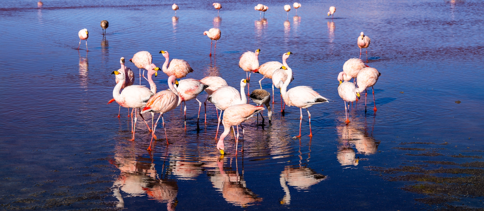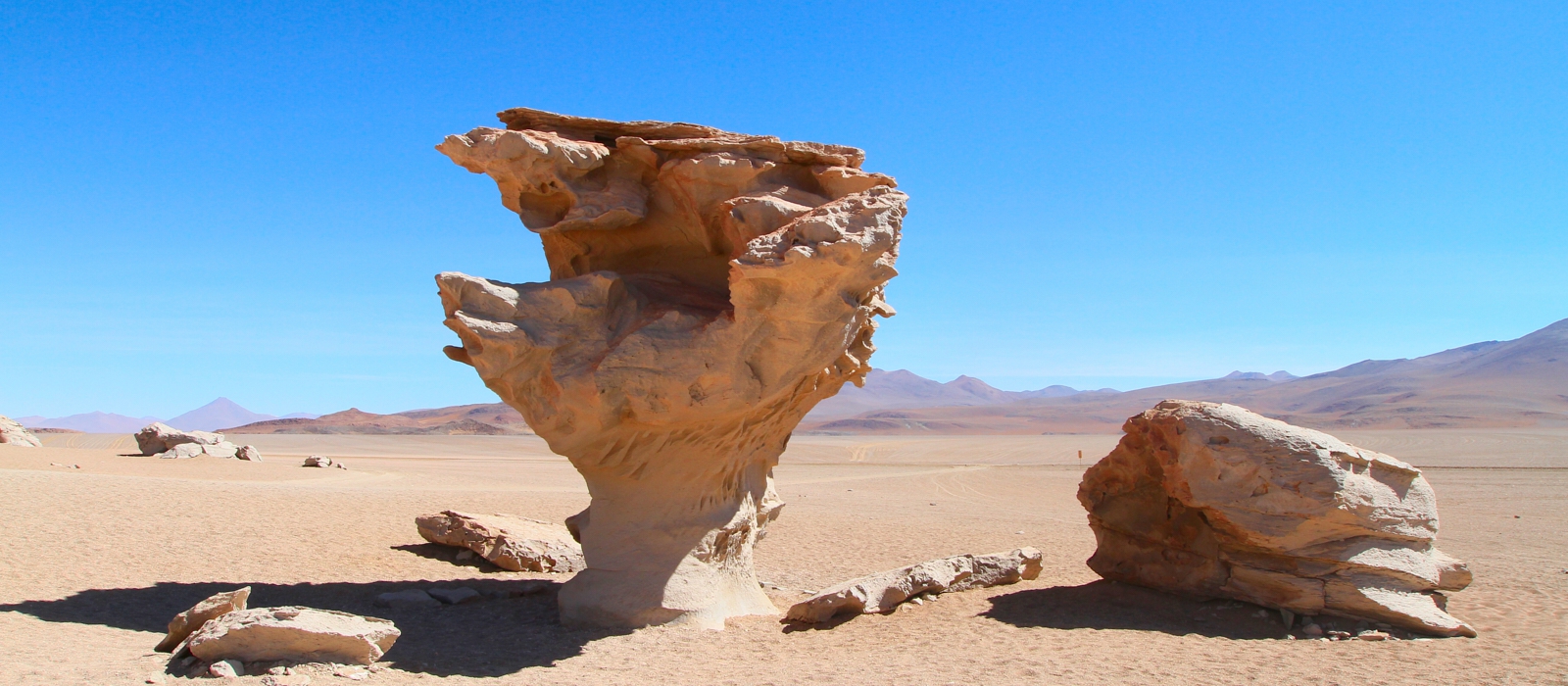 We will then arrive at the Capiña Salt Flat where borax is mined, passing by the distant mountains, that look like cities; the Ciudad de Piedra and Ciudad Italia. We will arrive at Laguna Colorada to sip a delicious hot chocolate while watching three different species of flamingos. As we continue on through the desert to the Stone Tree, we will pass the Blanca, Honda, Hedionda, Chiarcota and Negra Lagoons, to relax and have lunch. We will then drive past the Ollague Volcano on our return to Uyuni.